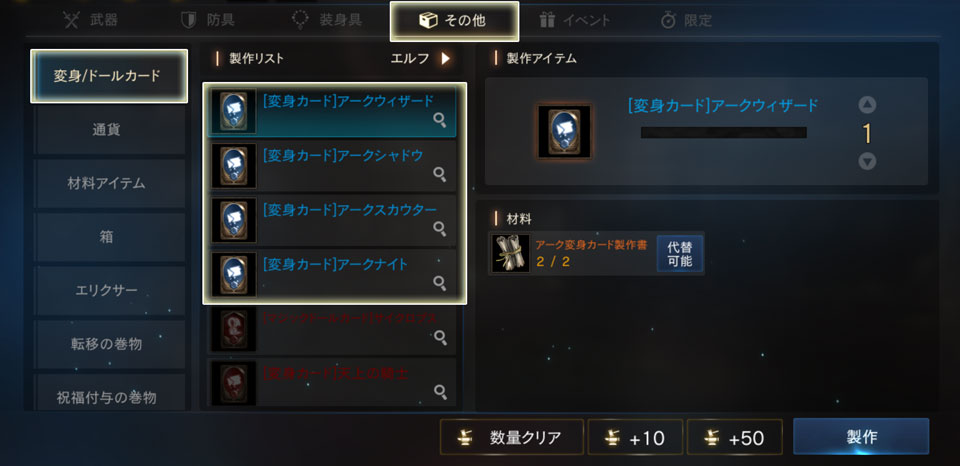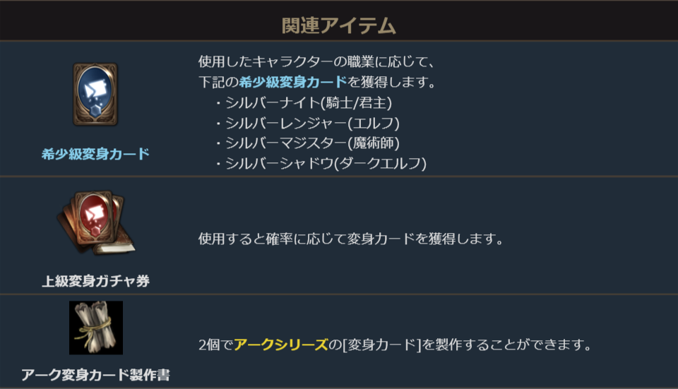 「アーク変身カード製作書」を2個集めると、希少級変身のアークシリーズを必ず製作できます。