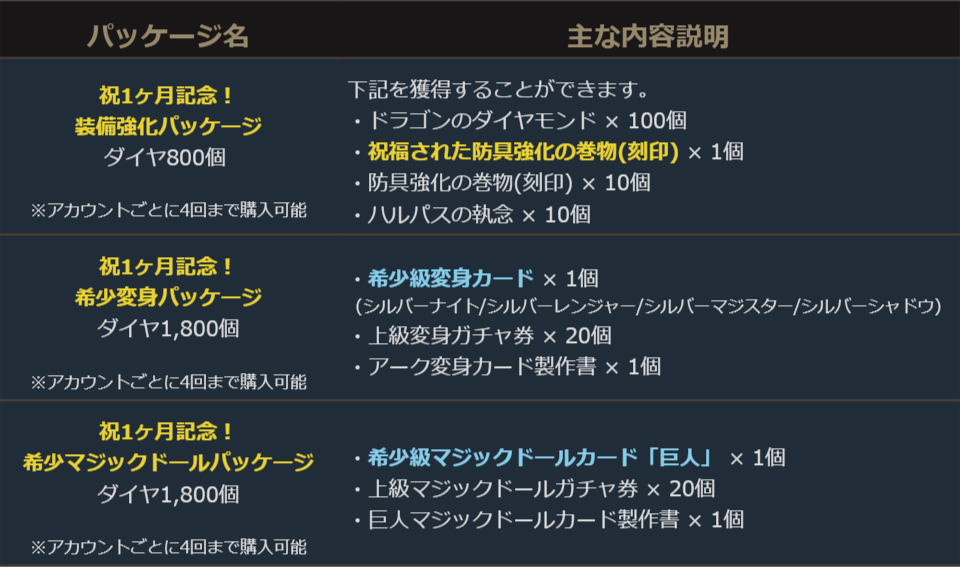 正式サービス開始1ヶ月を記念して、希少級の変身やマジックドールなどが獲得できる新パッケージが登場!