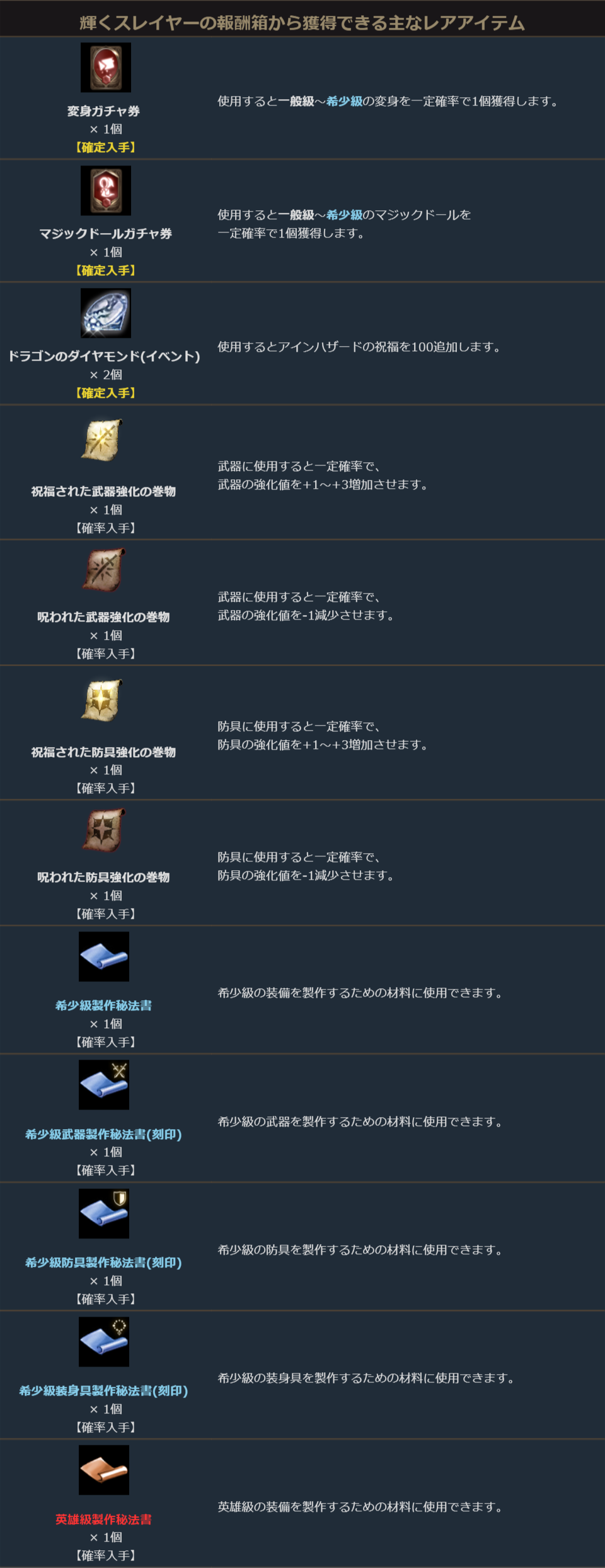 各ボスモンスターは討伐してもアイテムを落とすことはありませんが、攻撃した冒険者全員が「輝くスレイヤーの報酬箱」を獲得できます。