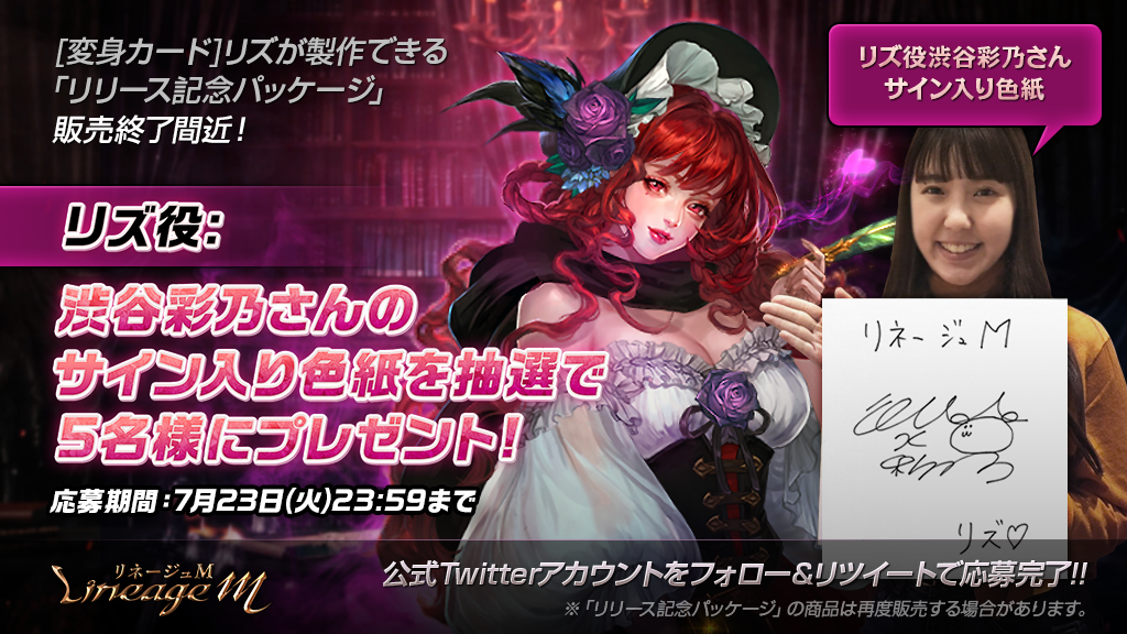 リネージュM公式Twitterアカウント(@LineageM_JP)をフォローして対象ツイートをRTすると、抽選で5名様に渋谷彩乃さん(リズ役)の直筆サイン色紙をプレゼント!