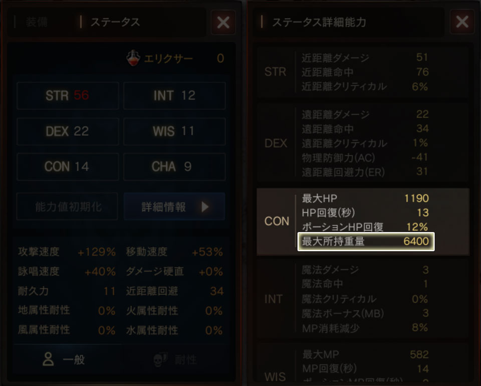 最大所持重量は、ステータス画面のCON欄に表示されているッスよ!