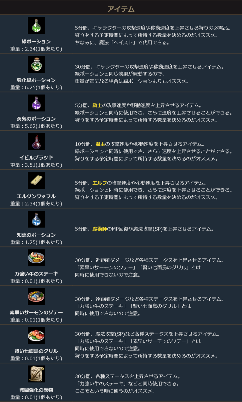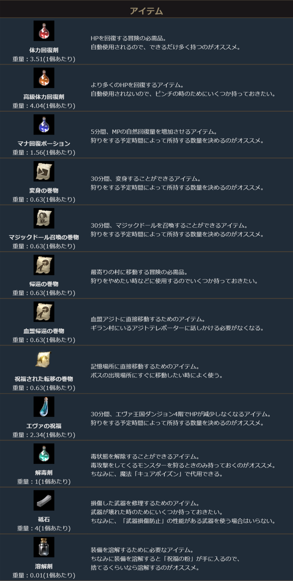 狩りでよく使いそうなアイテムの1個当たりの重量を記載しておくので、自分なりの所持する配分を考えてみるといいかもしれないッスね!