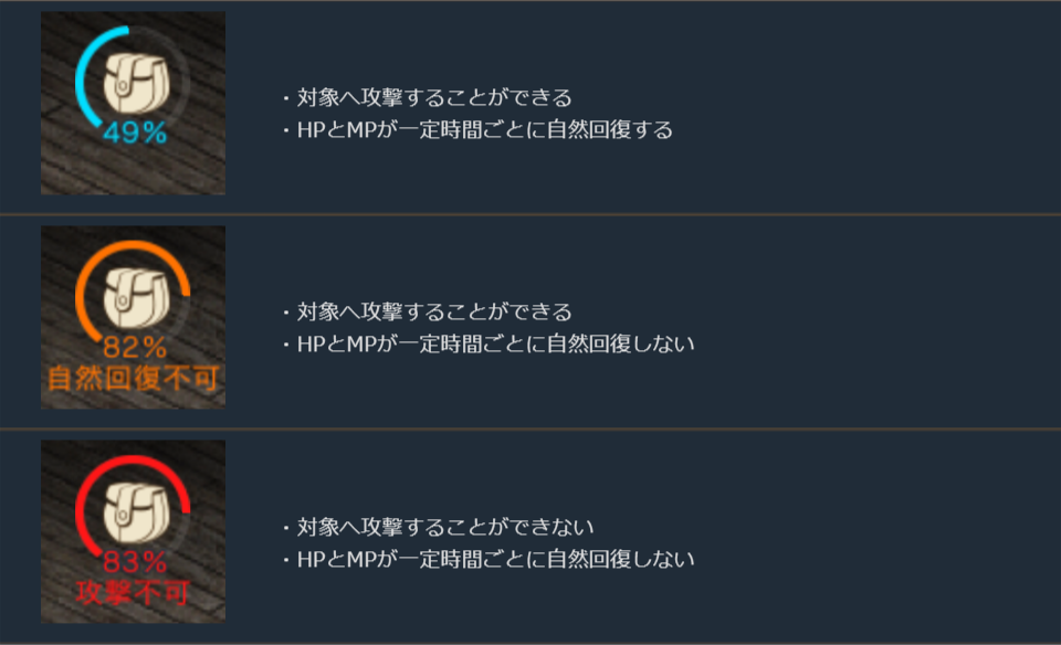 重量の状態によって、キャラクターがHPやMPが自然回復しない状態になったり、攻撃できない状態になるみたいッスよ!