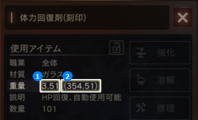 ① はそのアイテムの1個当たりの重量、② は現在所持しているそのアイテムの総重量が表示されているッス!