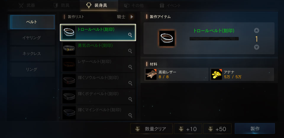 「高級レザー5個」と「50,000アデナ」で製作できるトロールベルトは、重量ボーナス+500の性能を持っているッス!