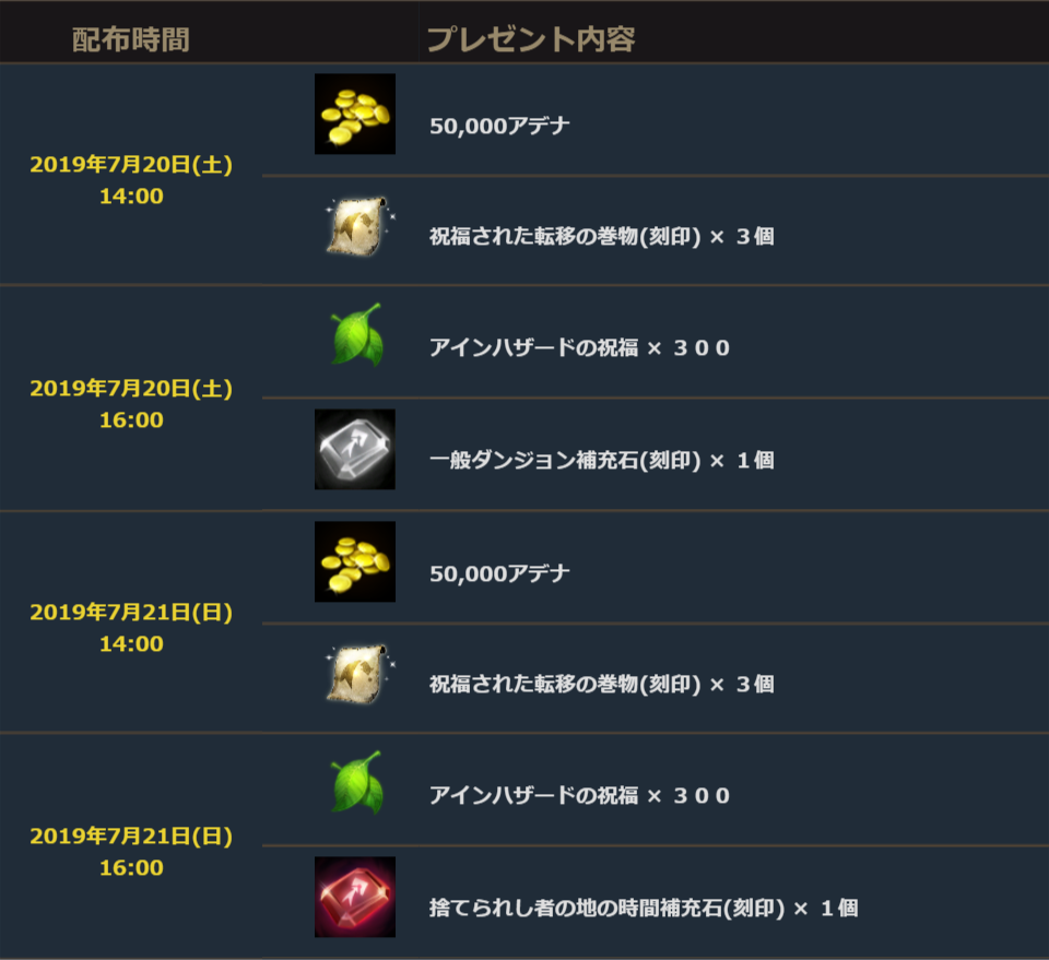 プレゼントは下記の時間にレベル50以上のキャラクターがいるアカウントへ郵便で配布されます。