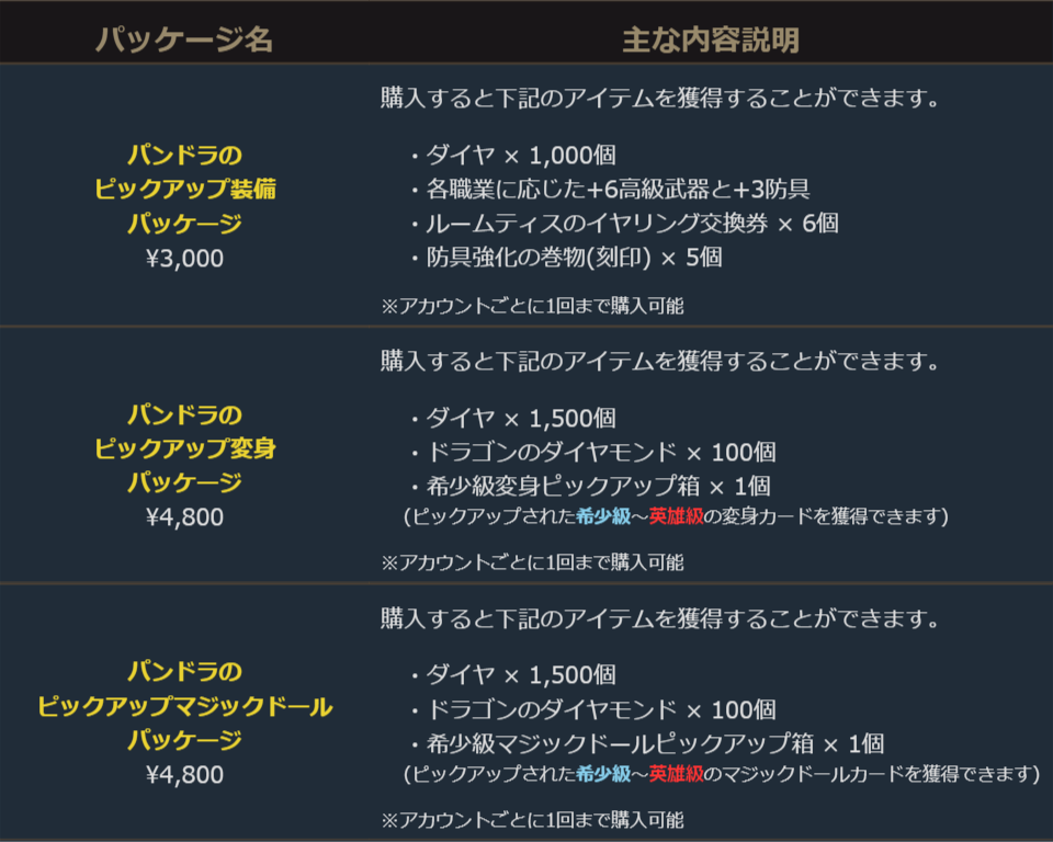 パンドラがピックアップした装備や変身などをお得に獲得できる「パンドラのピックアップパッケージ」についてお知らせいたします。