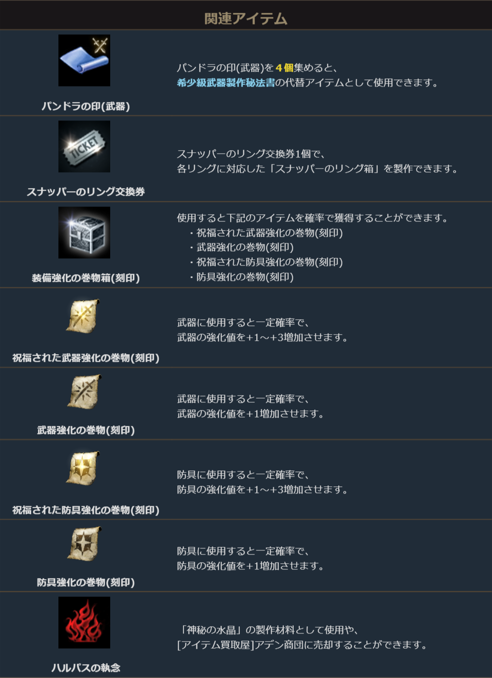 各パンドラの補給パッケージの購入で1つずつ獲得できる「パンドラの印(武器)」を4つ集めると、希少級武器製作秘法書の代替アイテムとして使用することができます。