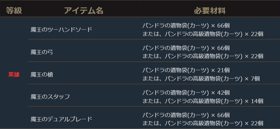 パンドラの遺物袋(カーツ)やパンドラの高級遺物袋(カーツ)を材料に、英雄級のゲートルを製作することができます。
