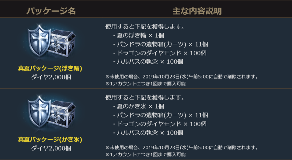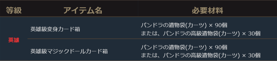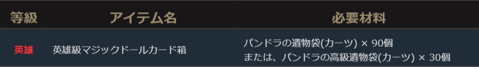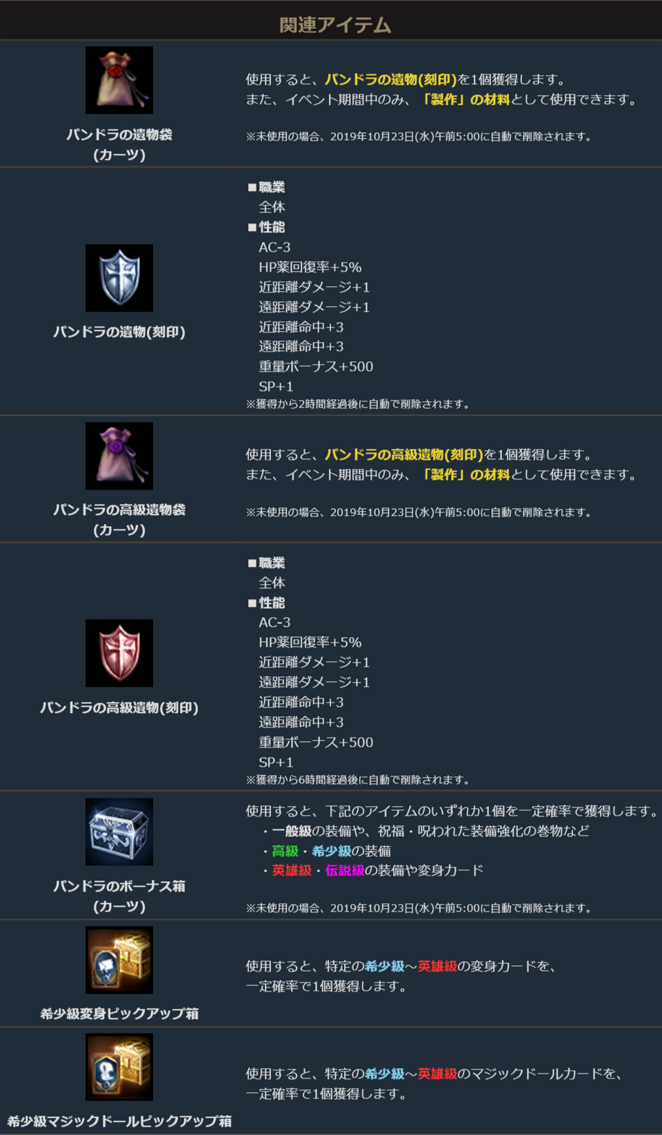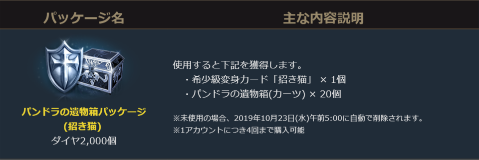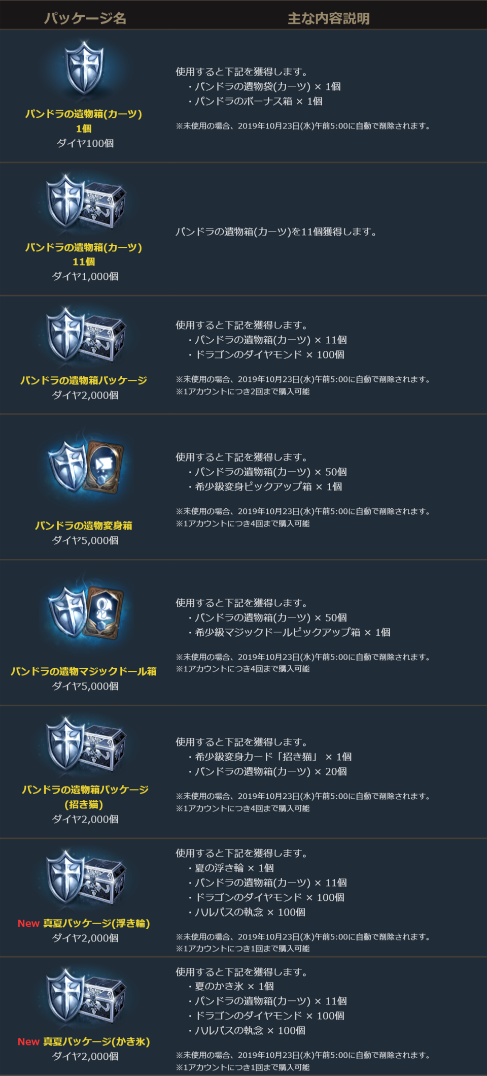 ※「パンドラの遺物箱(カーツ)1個」、「パンドラの遺物箱(カーツ)11個」、「パンドラの遺物箱パッケージ」、「パンドラの遺物変身箱」、「パンドラの遺物マジックドール箱」は2019年8月28日(水)メンテナンス開始時まで購入できます。