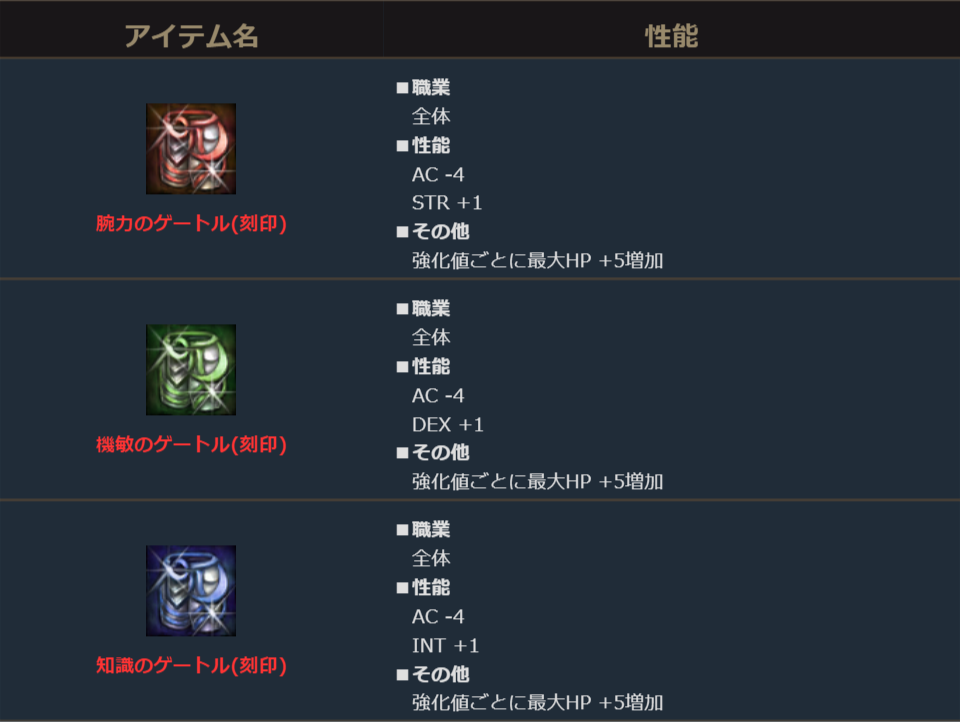 STRなどのステータス上昇や、強化値に応じて最大HPが上昇する特徴を持っています。