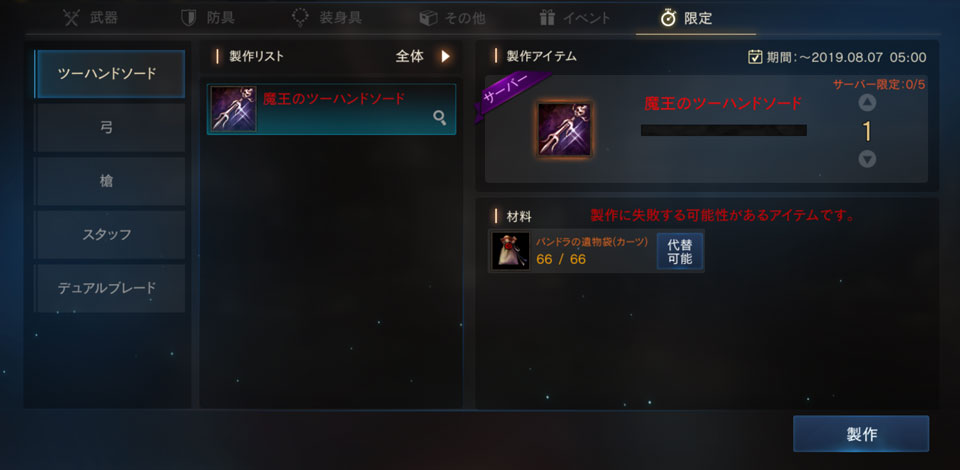 ※サーバー数量限定の製作アイテムは、製作に失敗する場合があります。