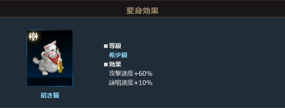 パンドラの遺物箱パッケージ(招き猫)を購入すると、すべての職業で使用できる希少級変身「招き猫」を必ず獲得することができます。