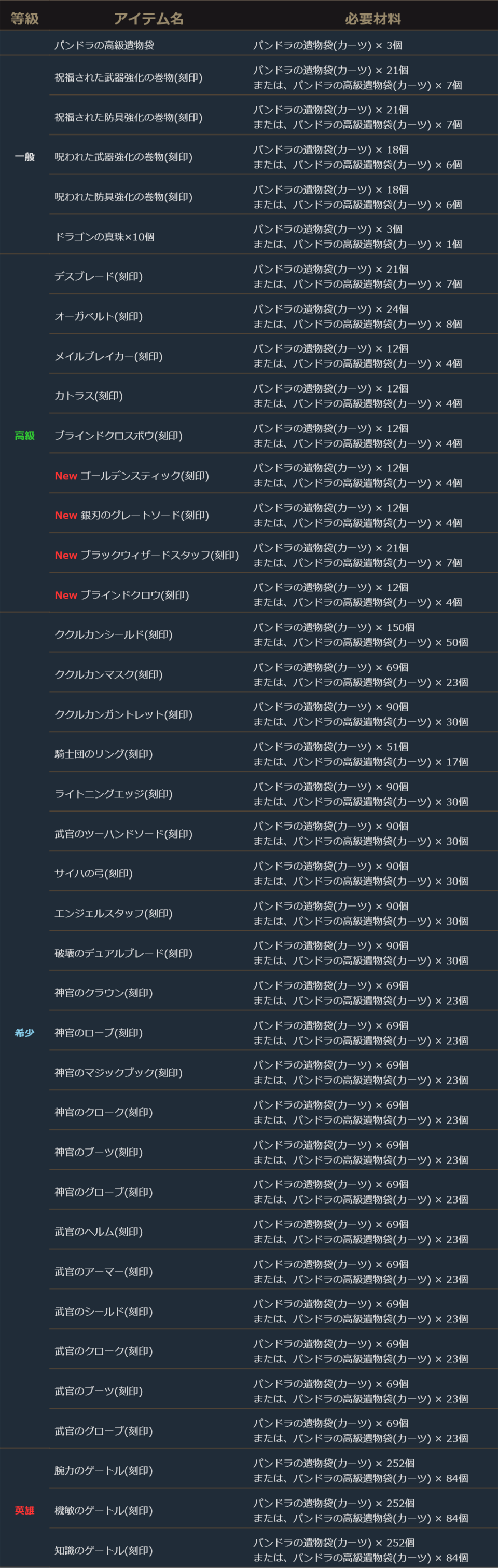 パンドラの遺物箱パッケージ(招き猫)の追加を記念して、パンドラの遺物袋(カーツ)が20個前後で製作できる冒険に役立つ高級武器4種類を関連イベント製作に追加しました。