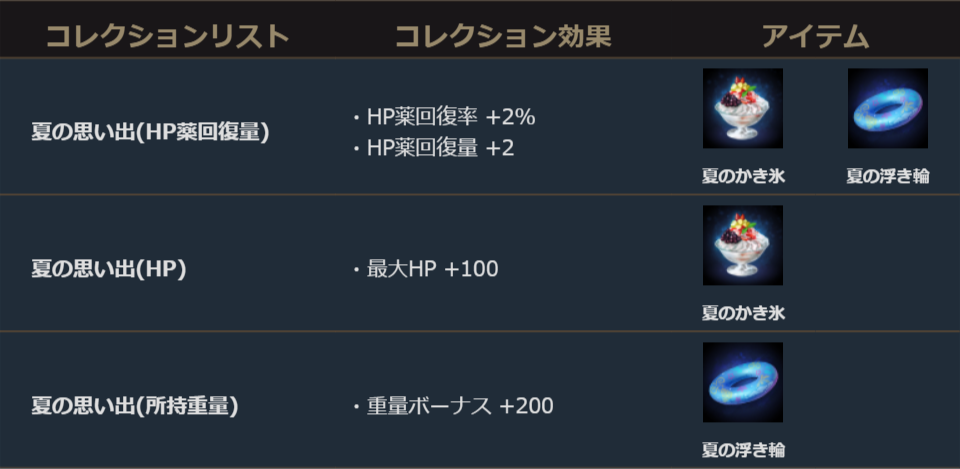 真夏パッケージ(かき氷)、真夏パッケージ(浮き輪)を購入すると、永続的に効果が発生するコレクションに登録できるアイテム「夏のかき氷」、「夏の浮き輪」をそれぞれ獲得することができます。