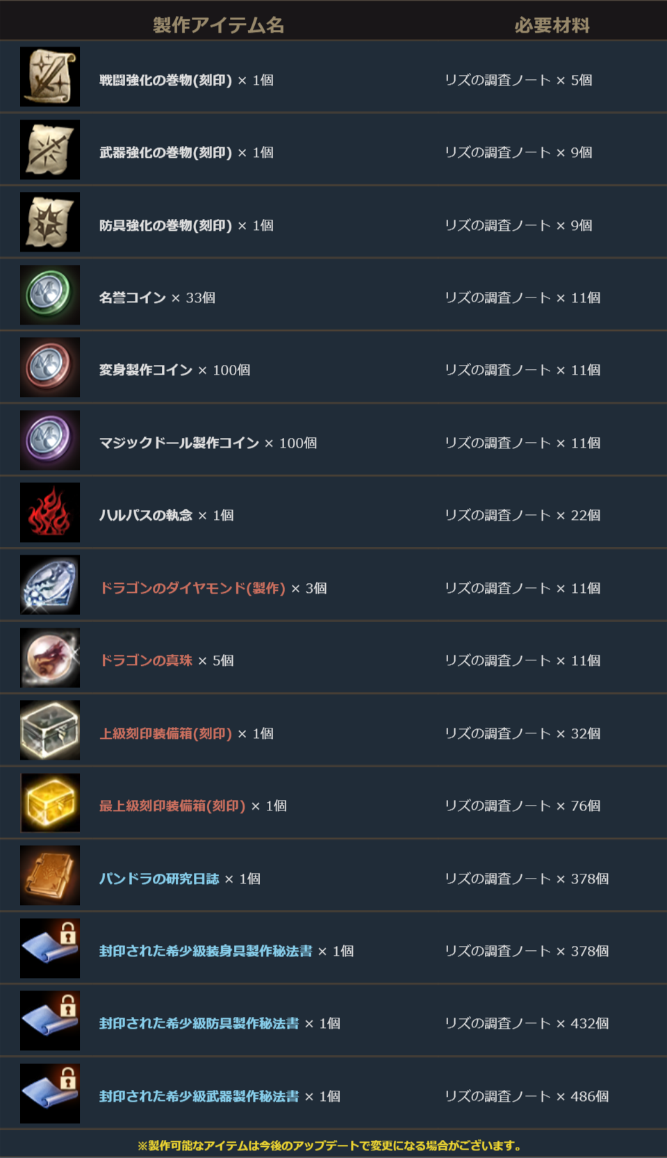 ※「リズの調査ノート」から製作できるアイテムは今後のアップデートで変更になる場合があります。