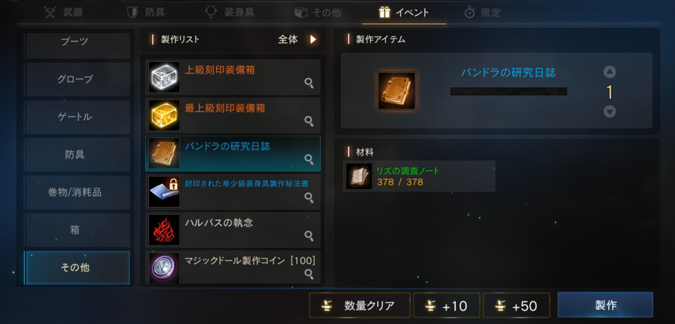 希少級~英雄級装備を獲得できる「パンドラの研究日誌」など、「リズの調査ノート」を使用してさまざまなアイテムを製作することができます。