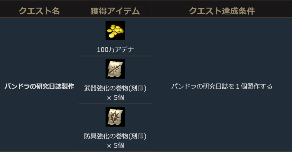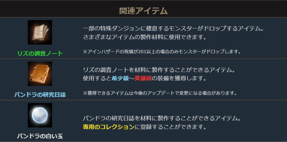 ※「パンドラの研究日誌」から獲得できるアイテムは今後のアップデートで変更になる場合があります。