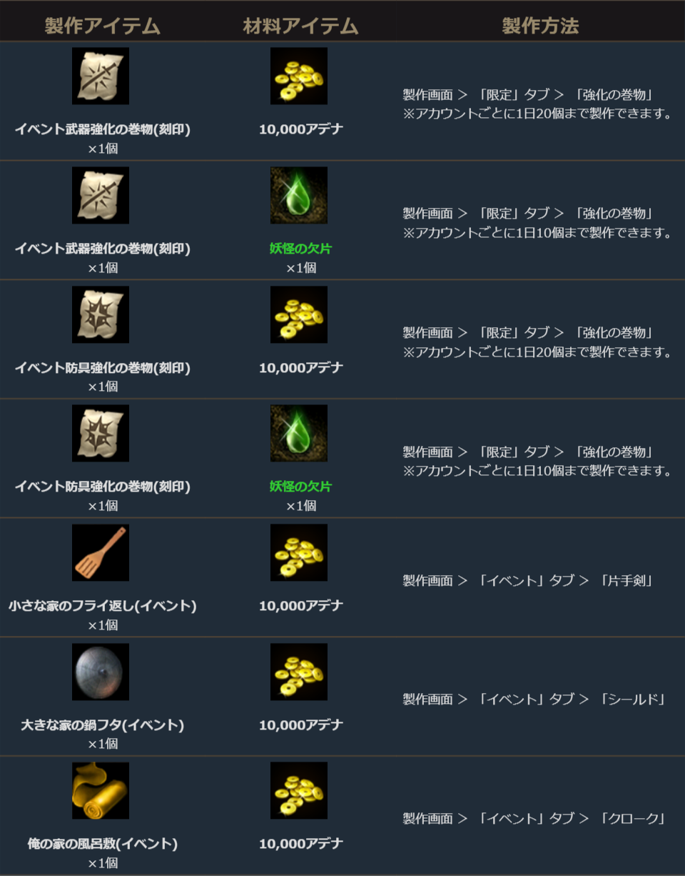 各イベントアイテムは製作によって獲得することができます。