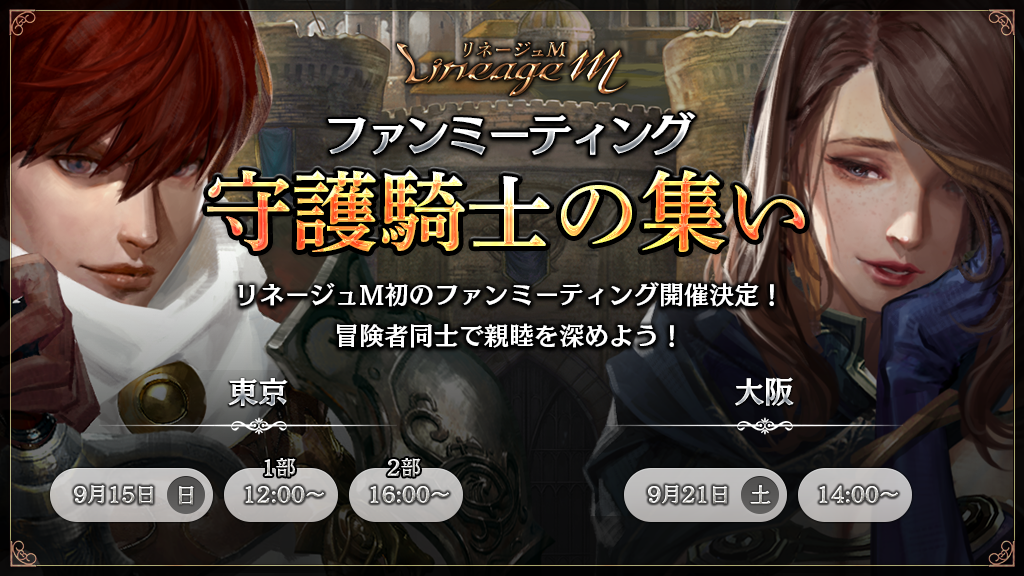 2019年9月15日(日)、9月21日(土)にリネージュM初の公式ファンミーティング「守護騎士の集い」の開催が決定いたしましたのでお知らせいたします。