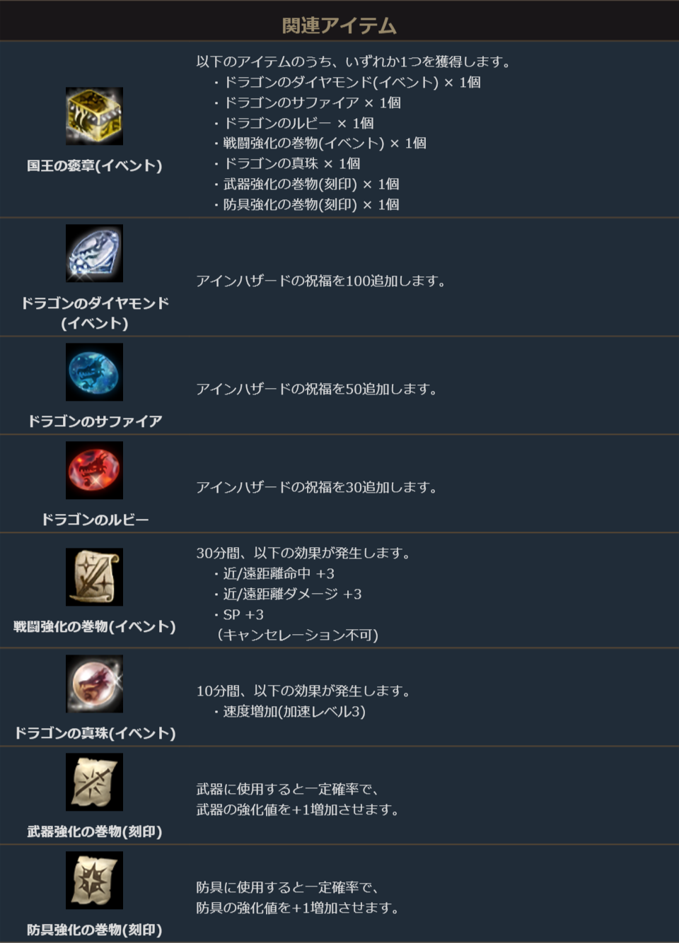 「国王の褒章(イベント)」を使用するとアインハザードの祝福を追加するアイテムや、より効率的に狩りができる「ドラゴンの真珠」、装備強化の巻物などを確率で獲得します。
