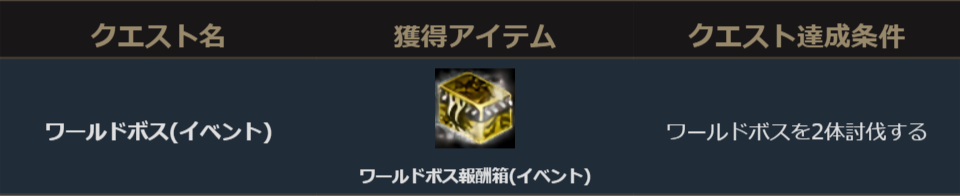 イベントクエストだけでなく日間ミッションの達成目標にもなっているので、ワールドボスは毎日忘れずにクリアしましょう!