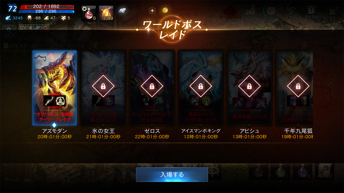 2. 入場可能なワールドボスレイドを選択し「入場する「ボタンを選択します。
