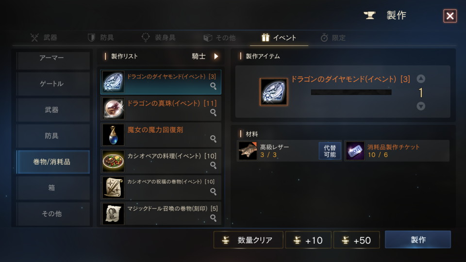 「消耗品製作チケット」を使用して、製作画面の「イベント」タブで、冒険や攻城戦に役立つ さまざまなアイテムを製作することができます。