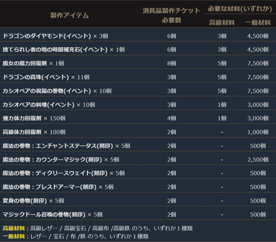 各アイテムの製作には「消耗品製作チケット」のほかに、鉄やレザーなどの「一般材料」、または、高級鉄や高級レザーなどの「高級材料」が必要となります。
