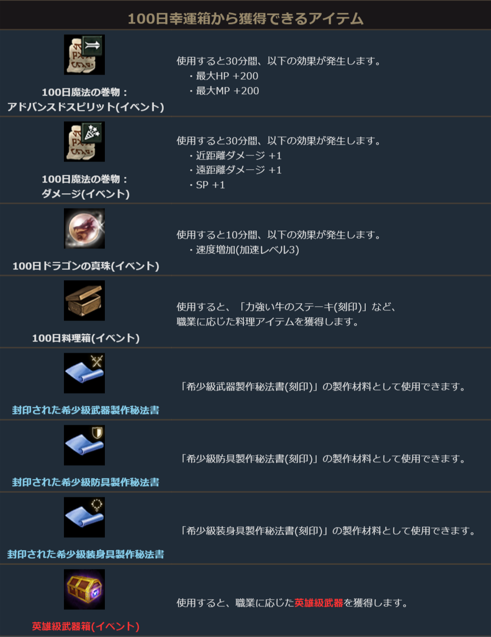 イベント期間中、ワールドボスや試練ダンジョンの報酬に「100日ケーキ箱(イベント)」が追加されます。