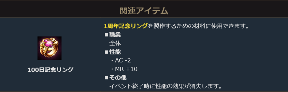 「100日記念リング」は、イベント期間中のみ防御力(AC)や魔法防御力(MR)の性能を上昇させる効果が発生します。