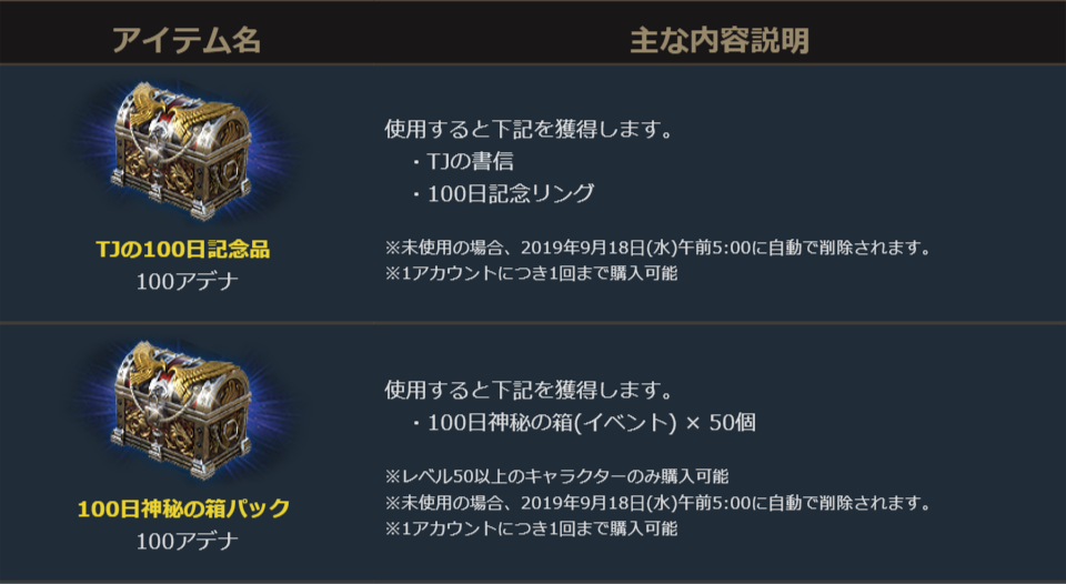 イベント期間中、「ショップ」にて100日を記念した特別なアイテム「TJの100日記念品」と「100日神秘の箱パック」を100アデナで購入することができます。