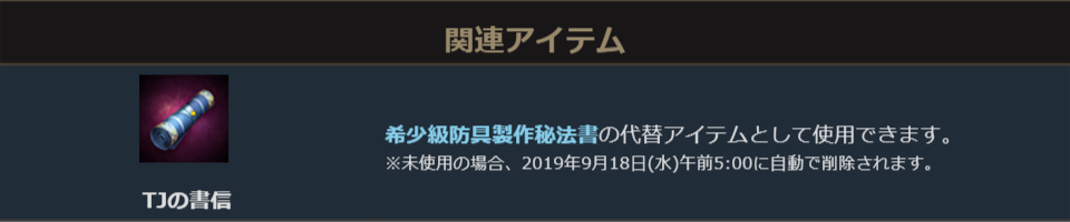 TJの100日記念品を使用すると、希少級防具製作秘法書の代替アイテムとして使用できる「TJの書信」と、1周年記念リングを製作するために必要となる「100日記念リング」を獲得することができます。
