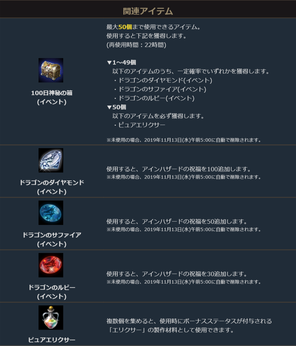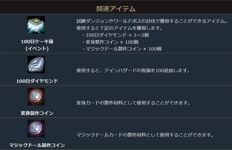 「100日ケーキ箱(イベント)」からはアインハザードの祝福を100追加する「100日ダイヤモンド」、「変身製作コイン」、「マジックドール製作コイン」を必ず獲得することができます。