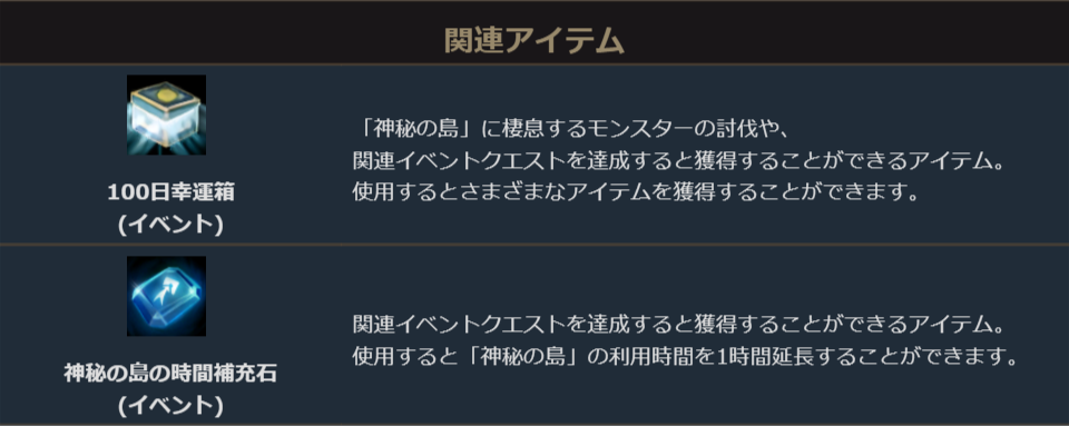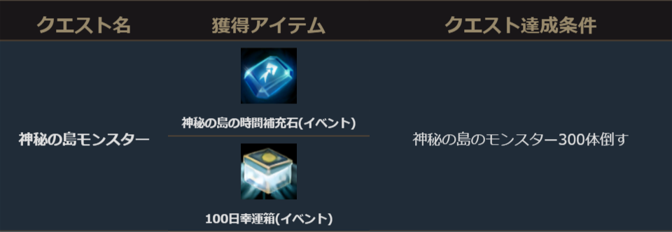 神秘の島に棲息するモンスターは、封印された希少級製作秘法書を確率で入手することができる「100日幸運箱(イベント)」をドロップします。