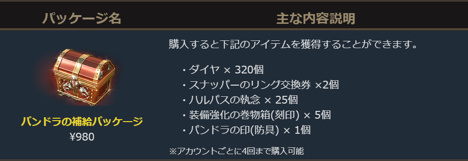 ※各パッケージは1アカウントにつき4回購入できます。