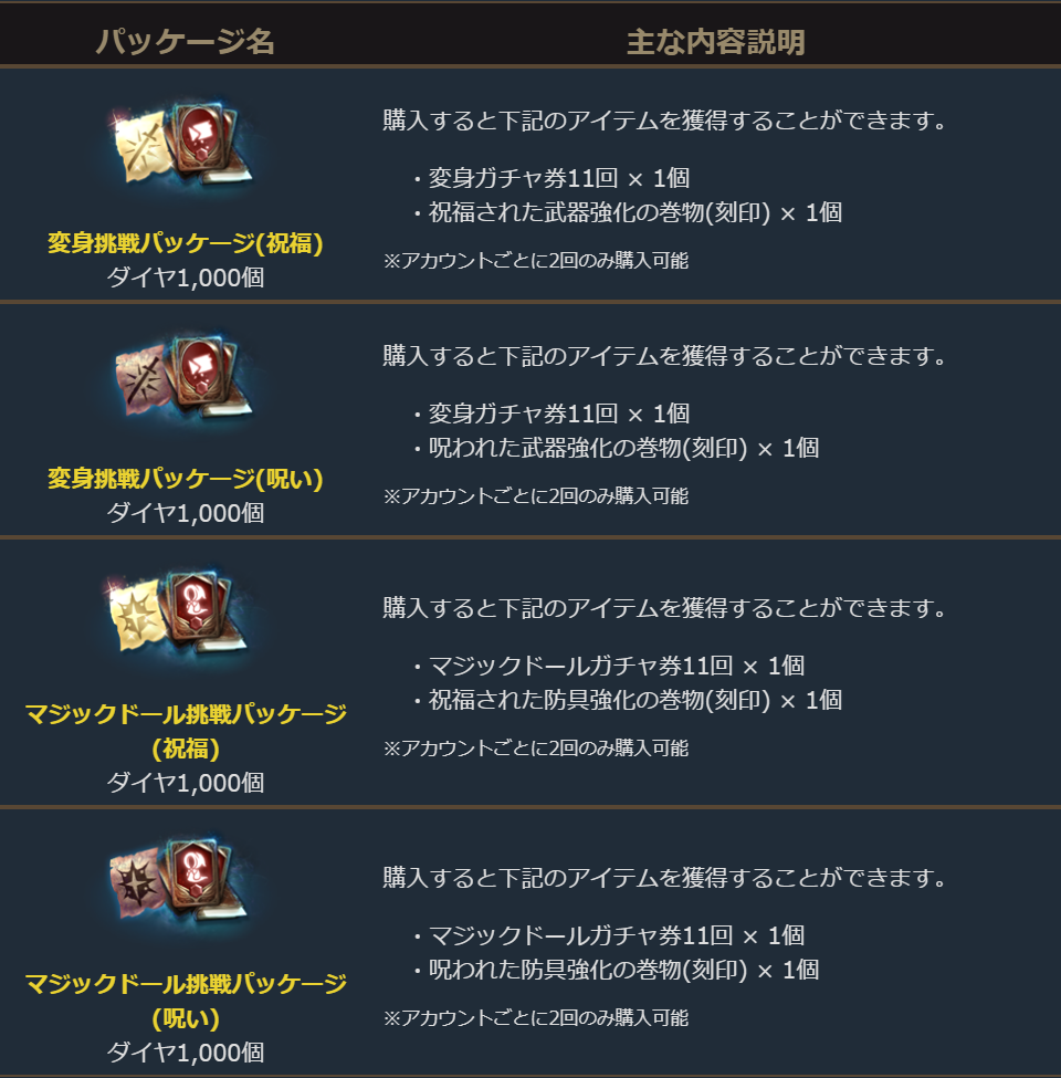 ※「挑戦パッケージ」はそれぞれ1アカウントにつき2回購入できます。
