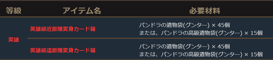 「[変身カード]ドレス少女」の製作は、「パンドラの遺物袋(グンタ―)×12個」または「パンドラの高級遺物袋(グンター)×4個」を使用して挑戦することができます。