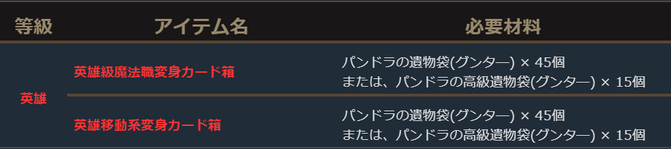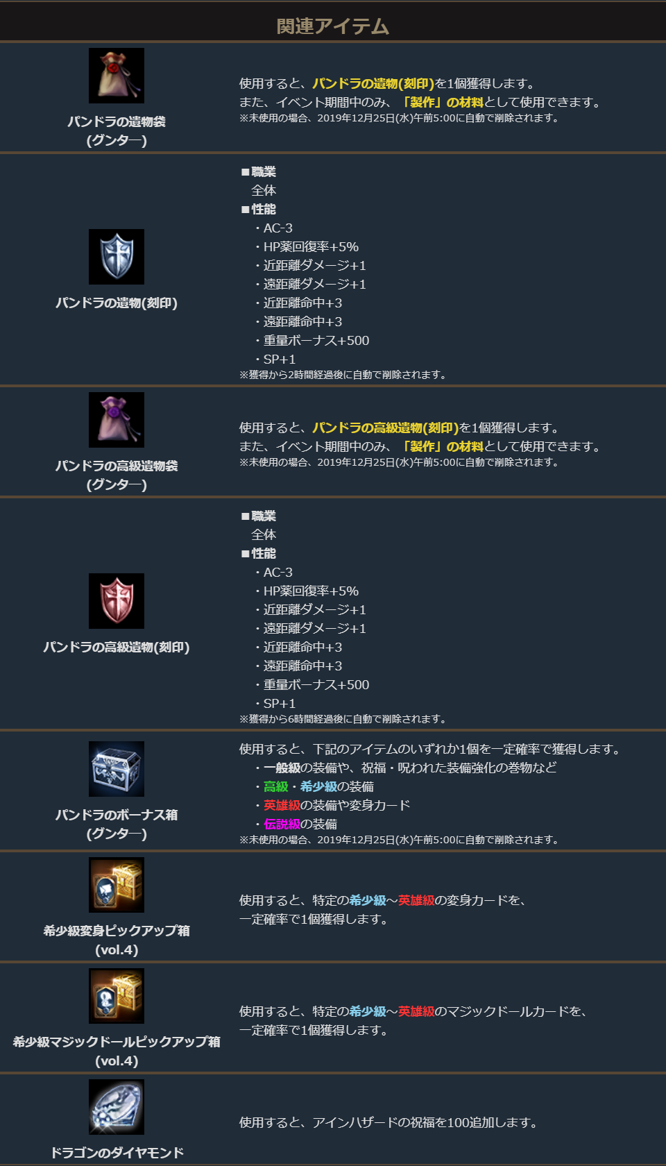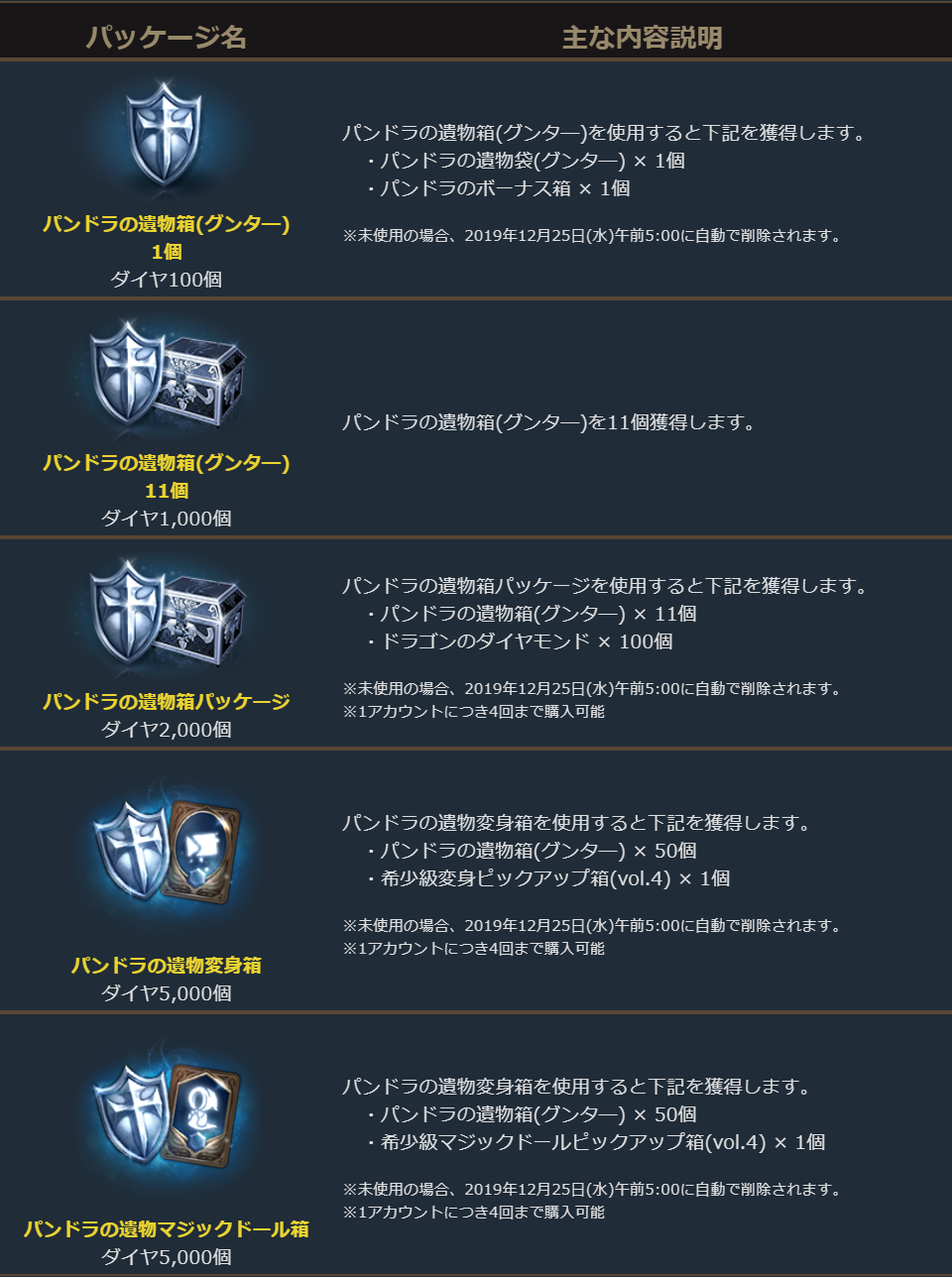 ※「パンドラの遺物箱(グンタ―)1個」、「パンドラの遺物箱(グンタ―)11個」、「パンドラの遺物箱パッケージ」、「パンドラの遺物変身箱」、「パンドラの遺物マジックドール箱」は2019年10月30日(水)メンテナンス開始時まで購入できます。