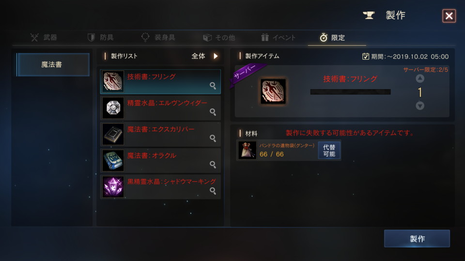 ※サーバー数量限定の製作アイテムは製作に失敗する場合があります。