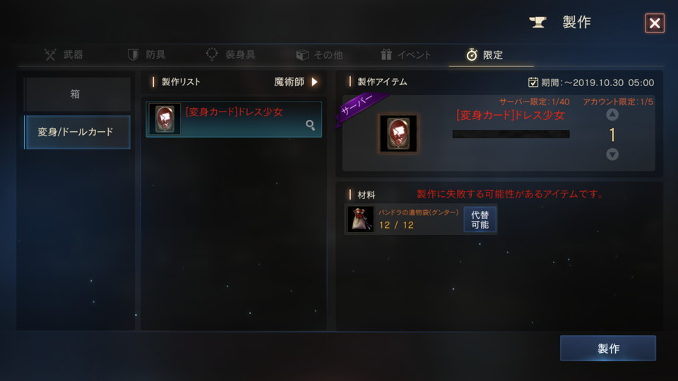 「[変身カード]ドレス少女」は各サーバーごとに製作できる数量に上限があり、また、1アカウントにつき5回までの製作制限があります。