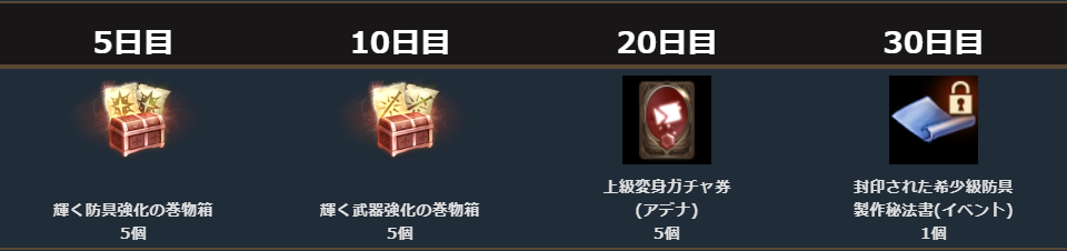 連続出席日数に応じて、追加報酬を受け取ることができます。