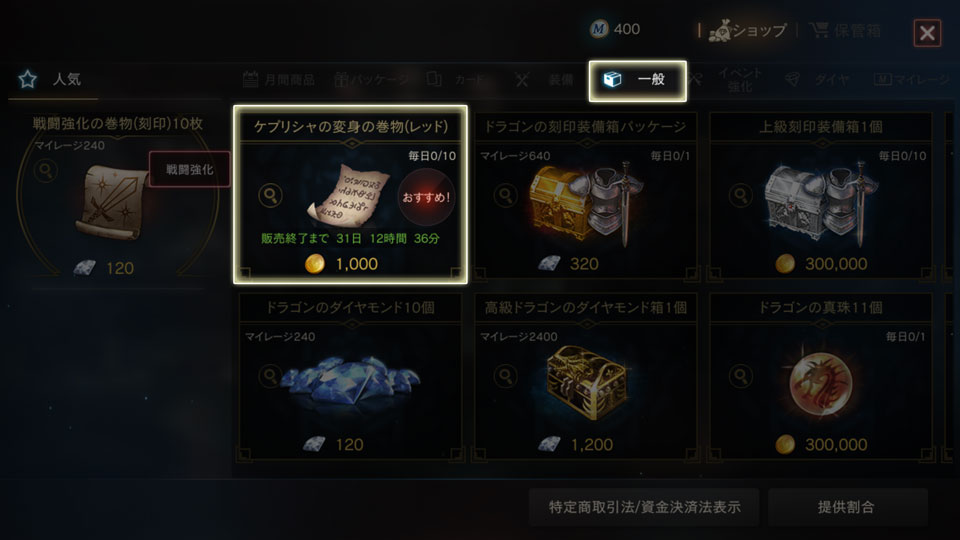 ショップ内の「一般」タブから1,000アデナで毎日10枚まで購入することができます!