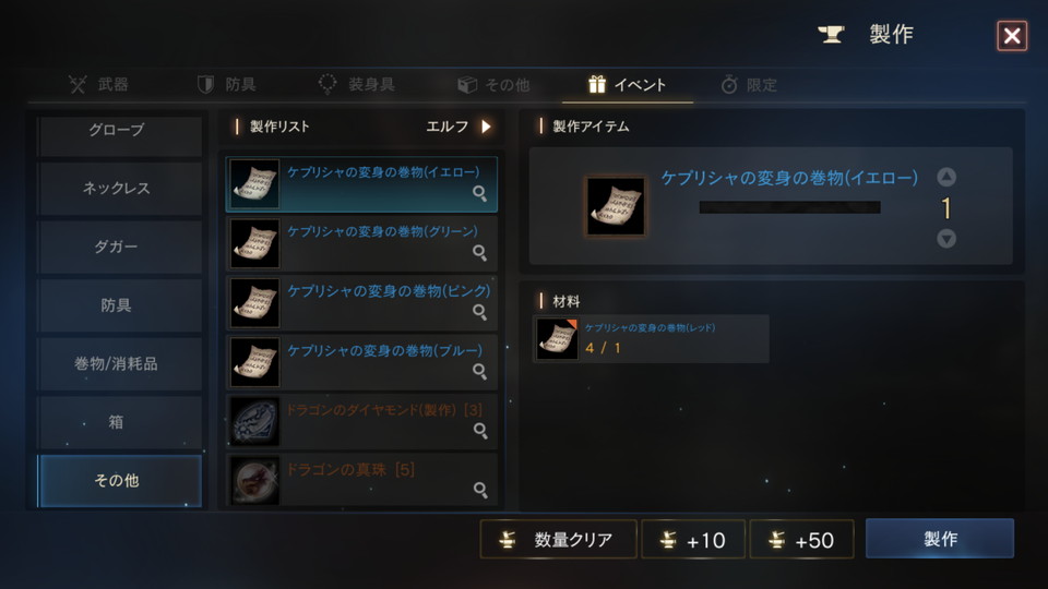 「ケプリシャの変身の巻物」の製作は、製作画面内の「イベント」タブ>「その他」から行うことができます。