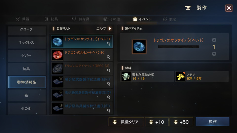 「N次元の亀裂」から獲得できる「薄れた魔物の気」を使用して、製作画面内の「イベント」タブ>「巻物/消耗品」から、アインハザードの祝福を追加することができる「ドラゴンのサファイア(イベント)」「ドラゴンのルビー(イベント)」を製作することができます。