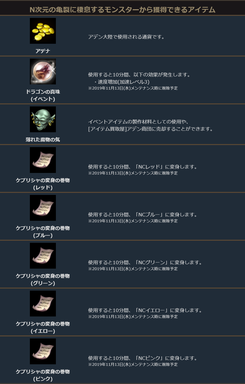 2019年10月16日(水)メンテナンス終了後~2019年11月13日(水)メンテナンス開始前まで(予定)