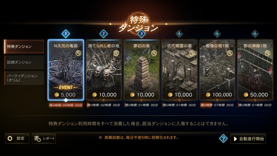 特殊ダンジョンの自動進行やログアウトプレイを使用する場合は、アイテムの準備をしっかりと行い「N次元の亀裂」から進行するように設定しましょう!