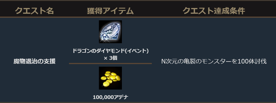 ※イベントクエスト「魔物退治の支援」は1日1回まで達成することができ、毎日午前5:00に初期化されます。