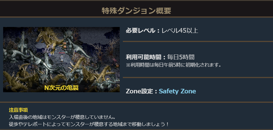 レベル45以上から挑戦可能な"Safety Zone"の特殊ダンジョンです。
