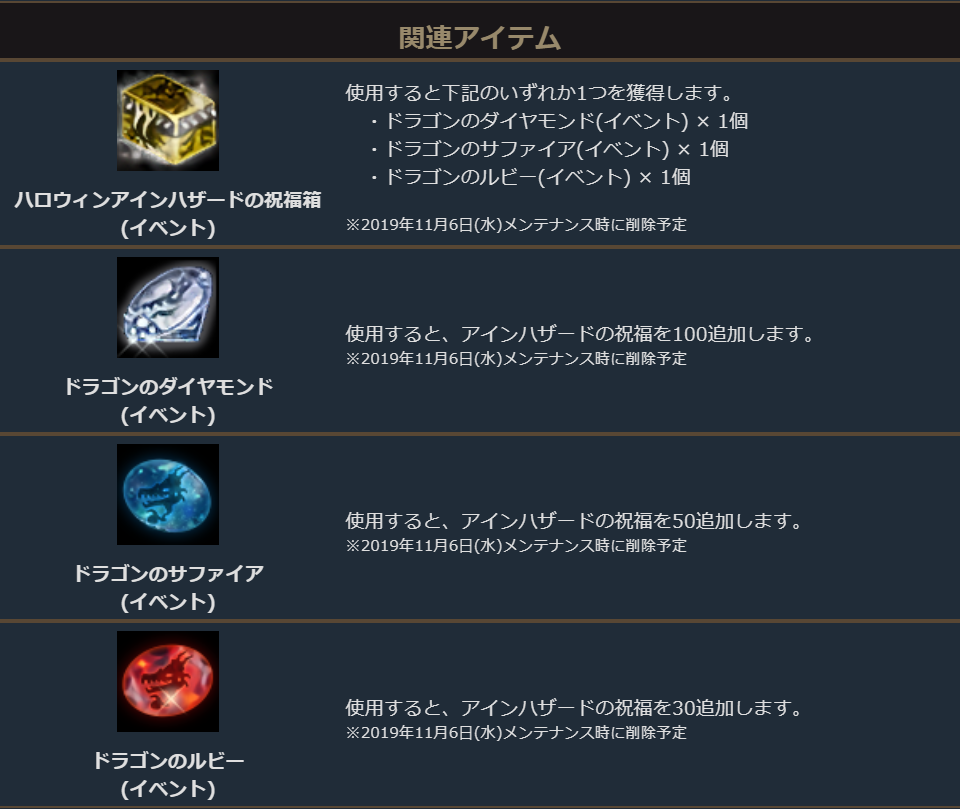 イベント期間中、試練ダンジョンの成功報酬に「ハロウィンアインハザードの祝福箱(イベント)」が1個追加されます。